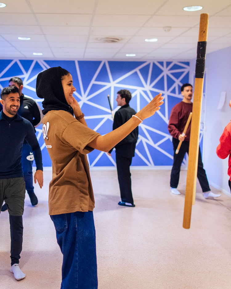 Fokus og konsentrasjonsevne er nøkkelen om du virkelig skal være til stede på scenen. I denne øvelsen beveger elevene seg rundt i rommet, mens stadig flere får tildelt en stav som de uten forvarsel kaster til en av de andre. Hvis én faller i gulvet, må alle begynne på nytt.